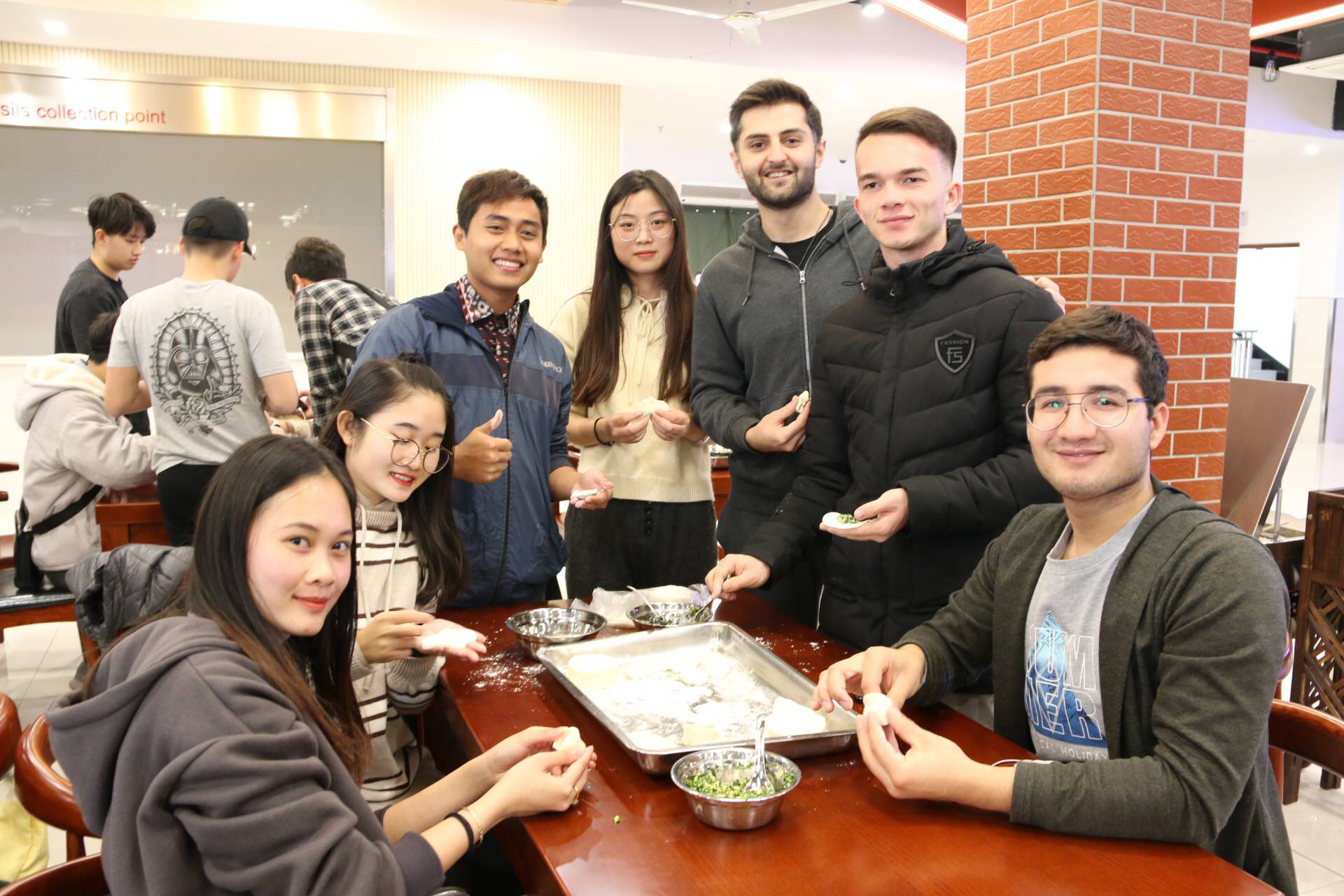 11月23号,为了让留学生进一步体验中国传统文化,丰富业余生活,商学院联合西太湖后勤公司组织学院留学生在西太湖食堂开展了包饺子活动。留学生管理员施雪琴老师和来自俄罗斯、乌兹别克斯坦、泰国、赞比亚和毛里求斯等十几个国家的五十多名留学生参加此次活动。