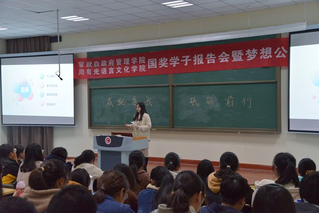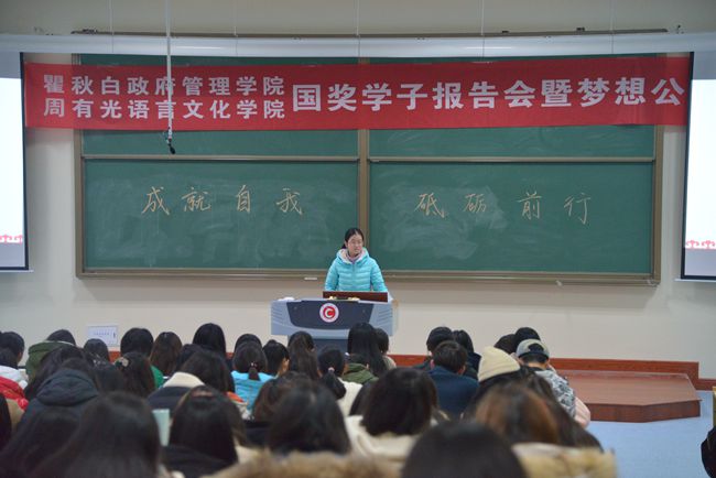 11月26号晚,瞿秋白政府管理学院、周有光语言文化学院国家奖学金学生先进事迹报告会暨学院梦想公开课在立德楼二阶举行。活动秉承“成就自我,砥砺前行”的主题,瞿秋白政府管理学院国家奖学金获得者丁晶、周有光语言文化学院国家奖学金获得者卢逸炜、李露露作为主讲嘉宾与大家交流分享大学生活以及学习感悟。瞿秋白政府管理学院、周有光语言文化学院学工办老师和2018级学生参加活动。