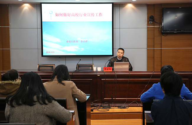 李吉祥从如何认识当前形势下宣传工作、做好行业宣传工作基本条件、如何做好舆情监测及处置、行业主题宣传的组织与开展、如何正确接待媒体采访五方面,结合当前新闻舆论热点和高校工作实际,深入剖析了当前高校行业宣传工作的要义,为培训人员上了一堂既有理论高度又有实用技巧的培训课。(通讯员 陈虎腾)