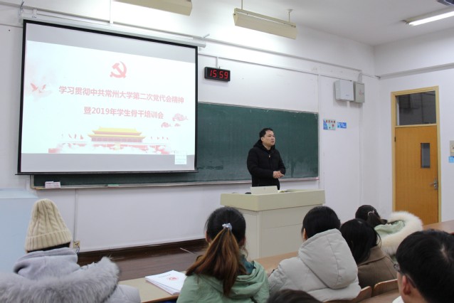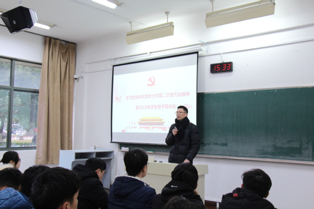 1月3日下午,制药与生命科学学院护理学院于W1101开展学习贯彻常州大学第二次党代会精神暨学生骨干培训会。学院党委副书记陆恒、学工办老师、本科生与研究生班级的班长、团支书、学生党员以及院团委、学生会、自律中心各部门骨干参加培训。培训由院党委副书记陆恒与学工办主任刘燕平主讲。