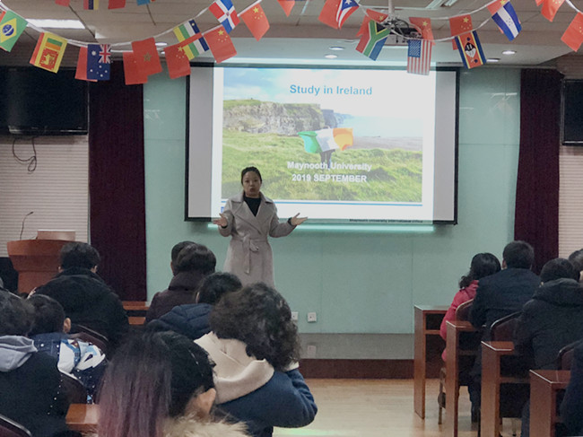 会上,梅大负责人介绍了爱尔兰的风土人情、爱尔兰留学的优势以及梅努斯大学的基本情况,并就签证材料递交时间、留学资金准备、存款金额和存款证明的开具要求等方面作了详细的讲解,一一解答了家长们关于雅思成绩、学习安排、学习费用、生活情况、获得的文凭等问题。
