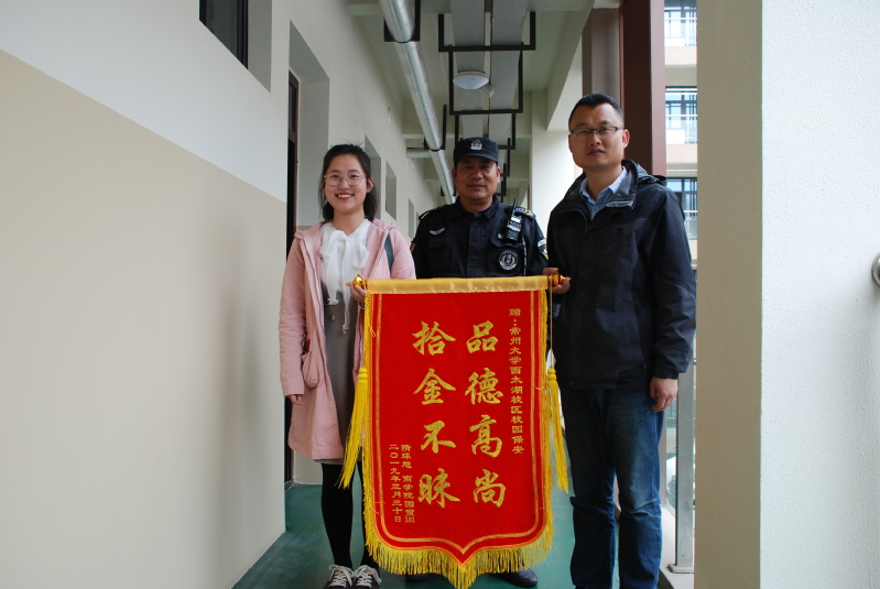 4月2日上午,商学院一学生给校区安保科送来“品德高尚 拾金不昧”的锦旗,以表示对安保队员的感谢。