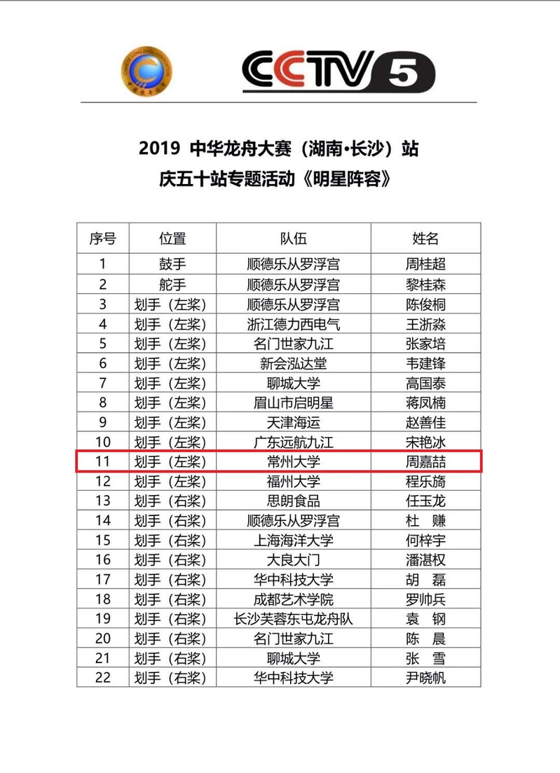 4月2日-3日,由中国龙舟协会与中央广播电视总台体育频道策划的中华龙舟大赛50站特别节目录制“明星阵容选拔赛”在广东顺德乐从龙舟训练基地举办。我校体育163(单)班周嘉喆同学在选拔赛中表现出良好的竞技状态,成功入选中华龙舟大赛“明星阵容”。