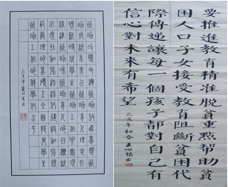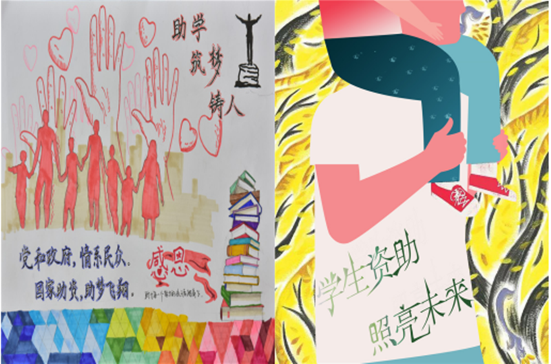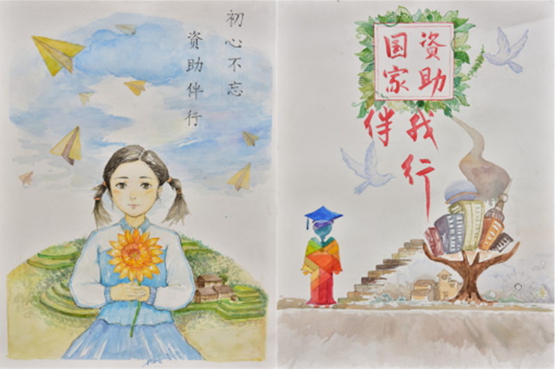 在各学院的精心组织和广大同学们的积极参与下,通过广泛征集、学院推荐,共有38幅书法作品、28幅宣传画进行校级评选,作品突出“国家资助 助我飞翔”主题,生动形象、格调高雅、创意新颖、形式多样。经专家评审,葛妍同学荣获书法作品一等奖,高心怡、苗建兰、郝雨柯、贺娜同学的《梯田上的希望》获宣传画专业组一等奖,蒙晓婷同学的《信鸽报喜》、陈浩天同学的《常怀感恩大有可为》获宣传画非专业组一等奖。