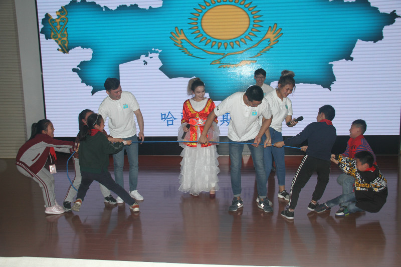 留学生用两个视频展示了哈萨克斯坦的壮丽景色,并具体讲解了哈萨克斯坦的国旗、地理位置、民族服装等。主讲团队的一首用哈萨克斯坦传统乐器冬不拉弹奏的乐曲将小学生带入了哈萨克斯坦广袤的草原,随后,拔河比赛和哈萨克斯坦传统舞蹈互动将整个活动氛围推向了高潮。