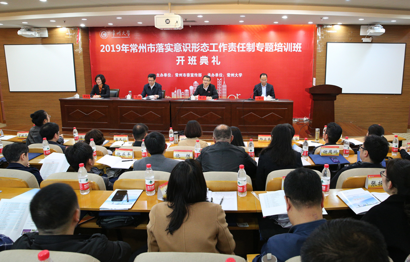 4月29日,常州市落实意识形态工作责任制专题培训班开班典礼在常州大学图书馆报告厅举行,常州市委常委、宣传部长陈涛,常州市委宣传部常务副部长孙春伟,校党委书记陈群、副校长黄海燕出席活动。常州市各辖市区委和市各部委办局、公司、直属单位党委(党组)分管领导或职能处室负责人共110余人参加此次培训。