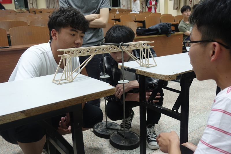 比赛中,参赛者须在规定时间内以木条、AB胶为材料,搭建一座能承受尽可能大的重力的“桥梁”。“桥梁”制成后,由工作人员用专业仪器为桥梁检测重量和跨度,以判断其是否合格。随后,各参赛小组在十分钟内依次以十秒的间隔为桥梁添加砝码,承受砝码多者获胜。激烈的角逐后,经评委评定,第六小组获得一等奖,第七、八小组获得二等奖,第四、十二、十三、十四、十八、二十小组获得三等奖,第一、五小组获得最受欢迎奖。