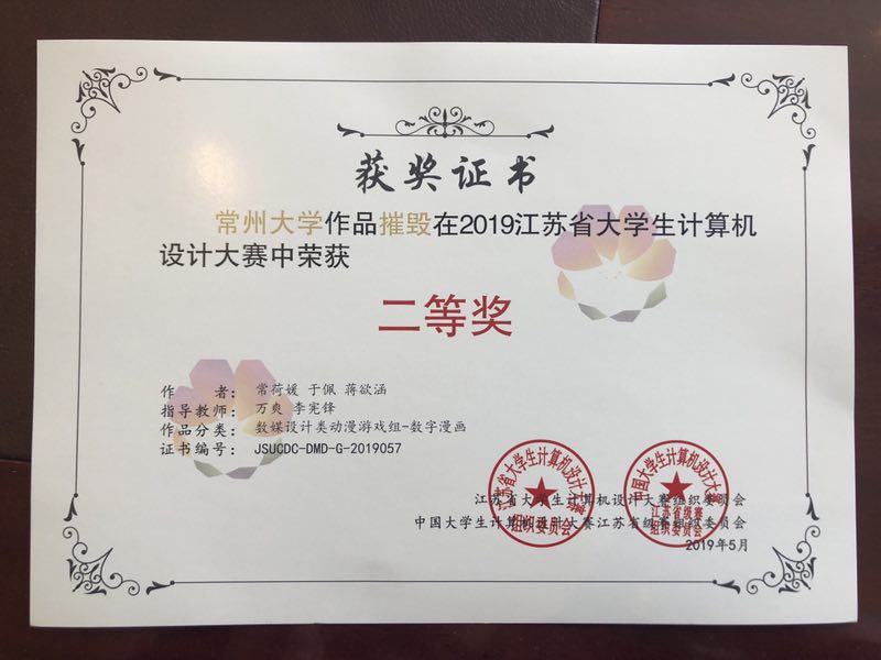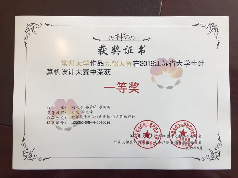 近日,2019 年“中电莱斯杯”江苏省大学生计算机设计大赛暨2019年(第12届)中国大学生计算机设计大赛江苏省级赛现场决赛在中国矿业大学南湖校区举行。我校艺术学院万爽、李宪锋两位老师指导的作品《九韶天音》(赵元浩、郭景洋、李婉琪)荣获“数媒设计类民族元素组”一等奖,作品《摧毁》(常荷媛、于佩、蒋欲涵)荣获“数媒设计类动漫游戏组”二等奖,该作品已被推荐参加国赛。