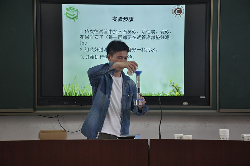 志愿者以VCR的形式为初一的同学们介绍了世界环境日和我校“凤舞霓裳环保服饰设计大赛”的内容,并向大家现场展示了环保手工服饰。随后,志愿者们在“环保小课堂”中介绍了我国现存的主要环境问题和治理方法,并带领同学们进行污水净化小实验,探讨日常生活中垃圾分类回收的相关知识。