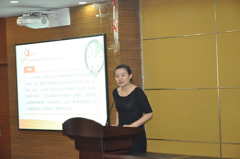 本次比赛历时一个多月,分为基础知识测试、案例分析、谈心谈话等三个环节,经过基础知识测试选拔,共有20名辅导员进入案例分析环节,通过案例分析的现场考验,最终10名辅导员入围谈心谈话比赛。案例分析和谈心谈话两个环节,着重考察辅导员综合运用法律法规、教育学、心理学、生涯规划及学生事务管理等相关知识解决现实问题的能力。谈心谈话采取情景再现的形式,题目涉及思想政治引领、心理健康教育、日常教育管理、校园危机事件应对等方面,选手们认真倾听助演人员所遇到的困惑,把握学生特征,运用相关政策,或细致耐心,或谆谆教导,充分展示了娴熟的工作技能和特色的工作方法,彰显辅导员“人生导师和知心朋友”工作本色。(通讯员 陈启迪)