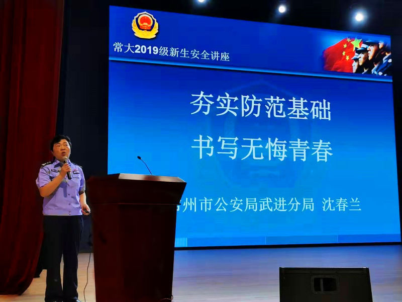 为增强新生个人安全意识、提高安全防范技巧,9月8日,武进公安分局网安大队一级警长沈春兰、常州市公安消防支队武进区大队工程师翟艳东应邀为西太湖校区2019级新生在立艺楼礼堂讲授大学第一课《安全教育》。信息数理学院、阿里云大数据学院、商学院、瞿秋白政府管理学院和周有光语言文化学院的近2000名新生及新生辅导员分上下午专场聆听了报告。