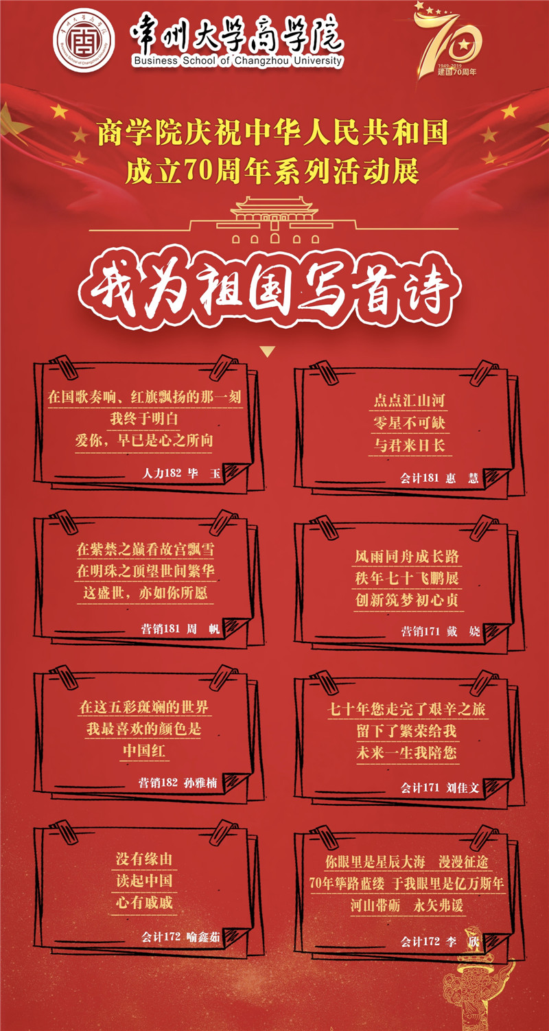 三行情诗,表白祖国。9月23—28日,商学院举办“我为祖国写首诗”主题活动,同学们积极响应,纷纷用三行简短的情诗,诉说对祖国深沉的爱。目前相关作品已在西太湖校区立德楼展出,营造了良好的校园氛围。