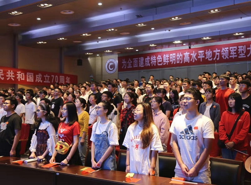 10月1日上午,庆祝中华人民共和国成立70周年大会在北京天安门广场隆重举行,20余万军民以盛大的阅兵仪式和群众游行欢庆新中国成立70周年。为进一步激发学生爱国热情,传承爱国主义传统,弘扬爱国主义精神,结合“不忘初心、牢记使命”主题教育,学工部组织300余名学生在文彰楼报告厅集中观看了实况直播。同时,各学院组织学生在会议室、教室、寝室等场所,通过电视、网络等收看大会盛况。