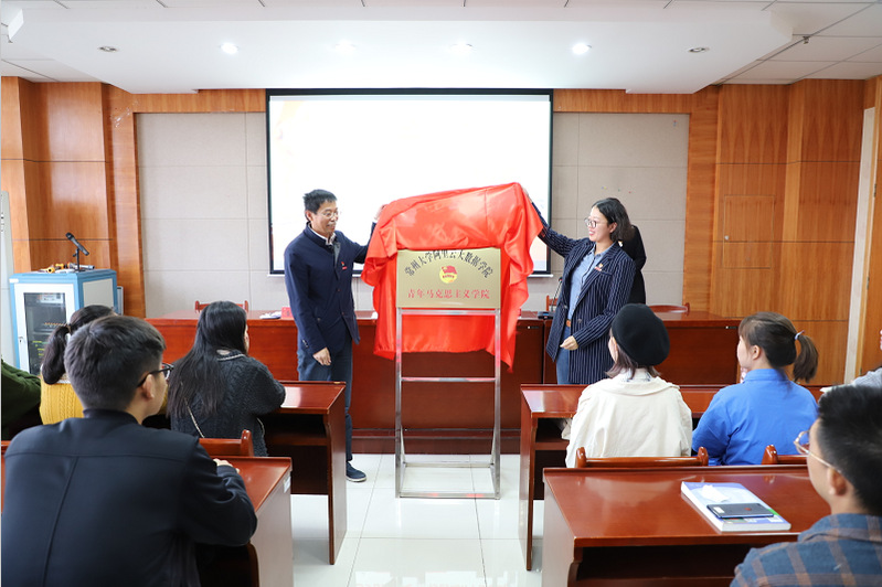 常愉介绍了院团委和青马工程工作情况。蒋琳与封红旗为青年马克思主义学院揭牌。