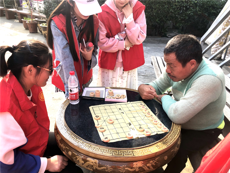 志愿者为老人送上精心准备的礼物。在与老人的亲切交流中,志愿者细心询问他们的身体和家庭情况,他们与老人在象棋盘上论英雄,和老人们一起翻看旧相册,教会老人如何使用智能手机……老人们对同学们的到来表示由衷的感谢。