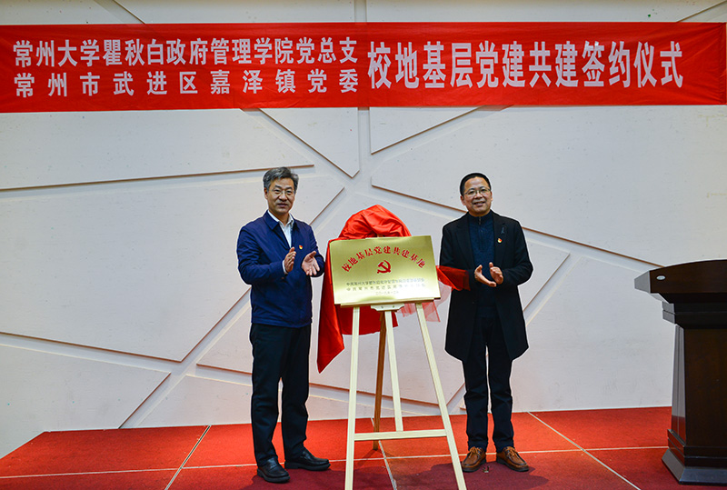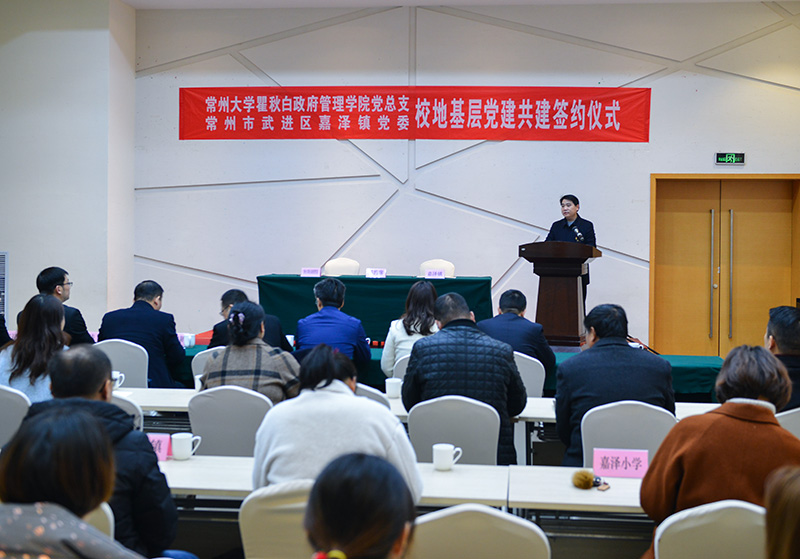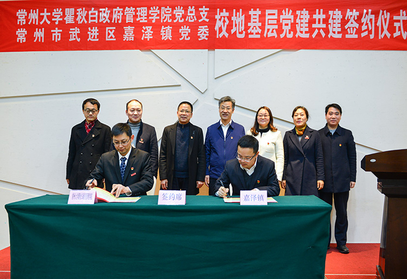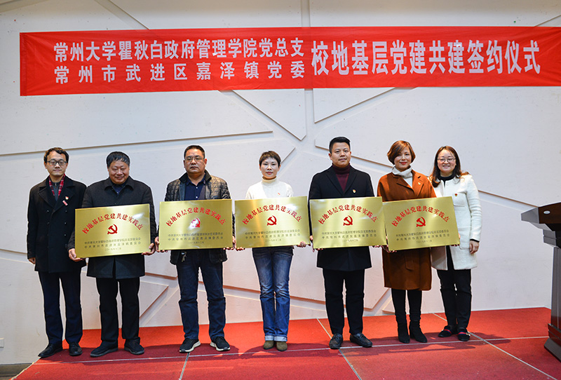 为深入贯彻落实习近平新时代中国特色社会主义思想和党的十九大、十九届四中全会精神,加强校地基层党组织建设,充分共享党建资源,坚持“优势互补、资源共享、联建联创、实现共赢”的原则,12月20日上午,瞿秋白政府管理学院党总支与武进区嘉泽镇党委在常州花木服务中心报告厅举行了党建共建合作签约仪式。