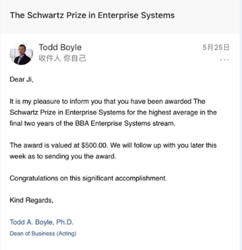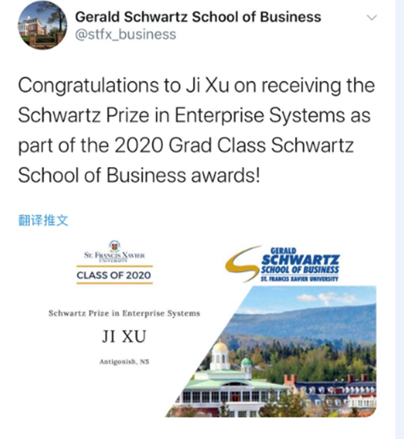近日,我校海外教育学院信管专业徐吉同学在加拿大合作院校圣西维尔大学以专业均分第一名的优异成绩毕业,被授予荣誉学士学位,同时喜获Schwartz奖学金,并荣登该校“院长荣誉榜”(Dean’s Honour List)。圣西维尔大学在学校官方新闻报道了徐吉同学的优异表现。