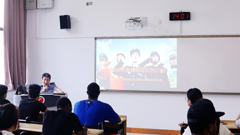 刘祺介绍了高校疫情防控原则——依法、科学、有序、人性,详细解读了防疫管控措施的相关法律规定,讲解了疫情管控期间涉外人士违反相关法律规定的典型案例,并与现场留学生就如何做好防范电信网络诈骗、遵守校纪校规等方面进行了交流讨论。