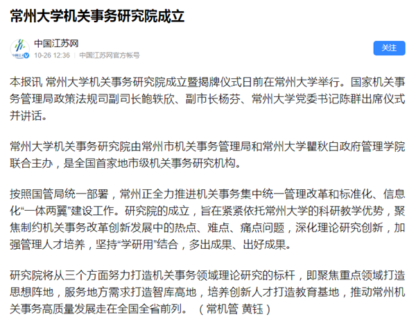 中国江苏网:常州大学机关事务研究院成立