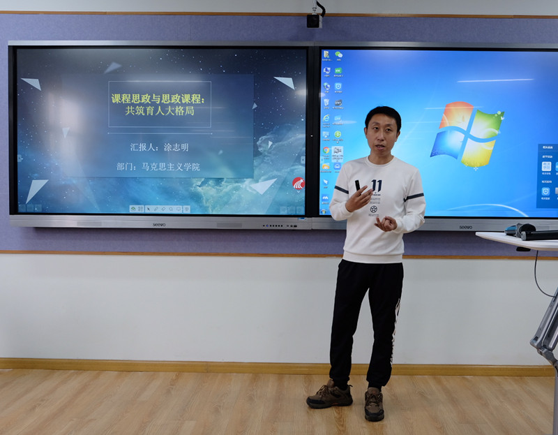 在“破冰”热身活动后,马克思主义学院涂志明博士分享了题为《课程思政与思政课程:共筑育人大格局》的主题报告。他从思政课程教师视角,围绕课程思政内涵、新时代思政元素挖掘及课程思政教学开展等内容进行分析。