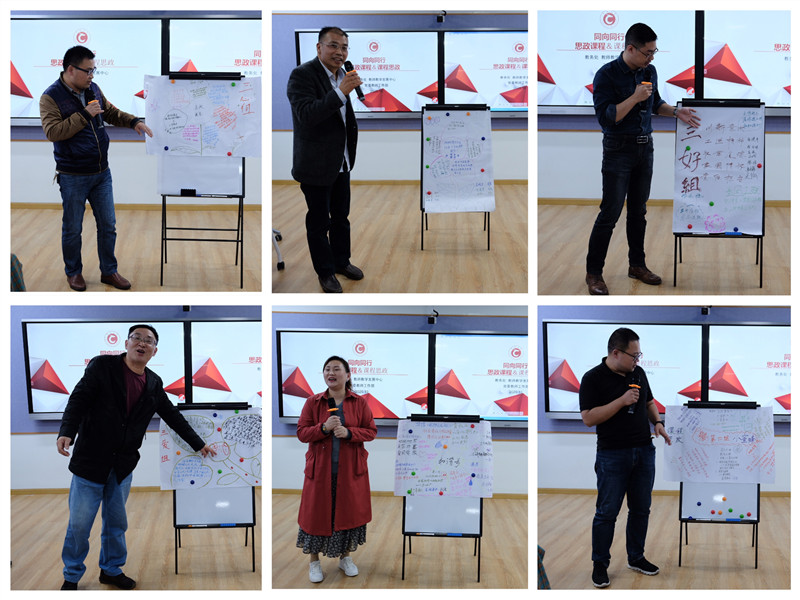 活动采取翻转课堂的形式进行,6组教师围绕“如何理解和如何践行课程思政”主题,结合报告内容和专业特点进行交流讨论,以图文并茂的方式展现讨论结果。各组组长分享培训心得。