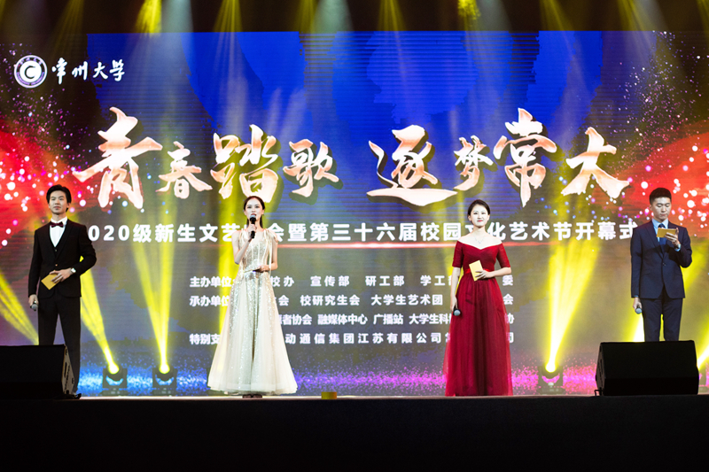 晚会在开场歌曲《我们都是追梦人》中拉开帷幕。校大学生艺术团以“常州三杰”之一瞿秋白同志为原型创编的大型舞蹈《秋之白华》,向中国共产党建党100周年献礼;校大学生舞蹈团演绎的舞蹈《心声》,以优美的舞姿和精湛的舞技欢迎来自祖国各地的新生;校街舞联盟的动感街舞《龙争虎斗》,赢得观众连连喝彩;海外教育学院的留学生们带来国际风采展,让同学们体味常大的多元魅力和国际风范;伴随着观众的热烈掌声,校舞动青春俱乐部的教职工带来舞蹈《唱脸谱》,将晚会推上高潮。同时,迎新的喜悦交织着校园十佳歌手的巅峰对决,选手们精彩演绎了《盛夏》《看不见》等歌曲,比赛按照战队合唱得分和选手个人风采展示得分角逐出了冠亚季军。戴国洪、郑德君为获奖选手颁奖。晚会在女子群舞《一抹红》中精彩落幕。