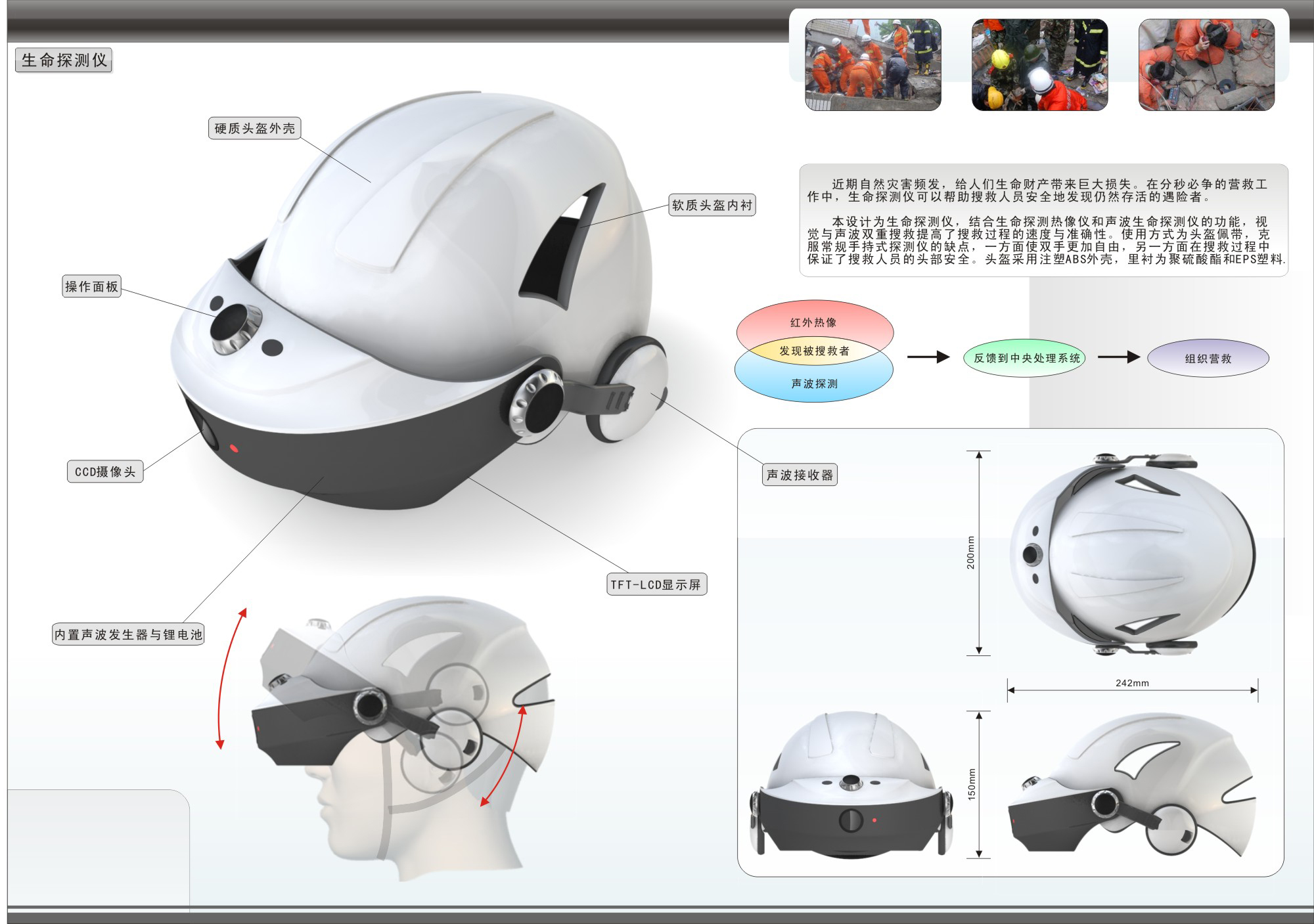 作品结合生命探测热像仪和声波生命探测仪的功能,利用视觉与声波双重搜救,提高了搜救过程的速度与准确性。在分秒必争的营救工作中,生命探测仪可以帮助搜救人员安全地发现仍然存活的遇险者,减少人们生命财产带来巨大损失。作品使用方式为佩戴头盔,克服了常规手持式探测仪的缺点,使双手更加自由,并在搜救过程中保证了搜救人员的头部安全。