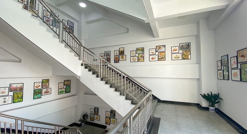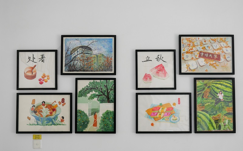 “二十四节气饮食养生图谱”以节气为主题,题材包括时令养生菜品、当季校园风景、日常生活起居等,共计96幅,画作由美术与设计学院同学手绘完成。画作陈列在科教城校区第一餐厅西楼道,辅以健康膳食宝塔大型墙绘,其中季节变换、节气交替的养生方法和食谱,为师生在不同季节时令里安排日常饮食起居提供了有益指导,集艺术性和科普性于一体。后期,营养研究院将以“鱼米之乡”为主题,用我校学生作品作为主要装饰完成健康营养餐厅的文化氛围布置,通过内涵丰富,、典雅别致的就餐环境向师生传达健康膳食理念。
