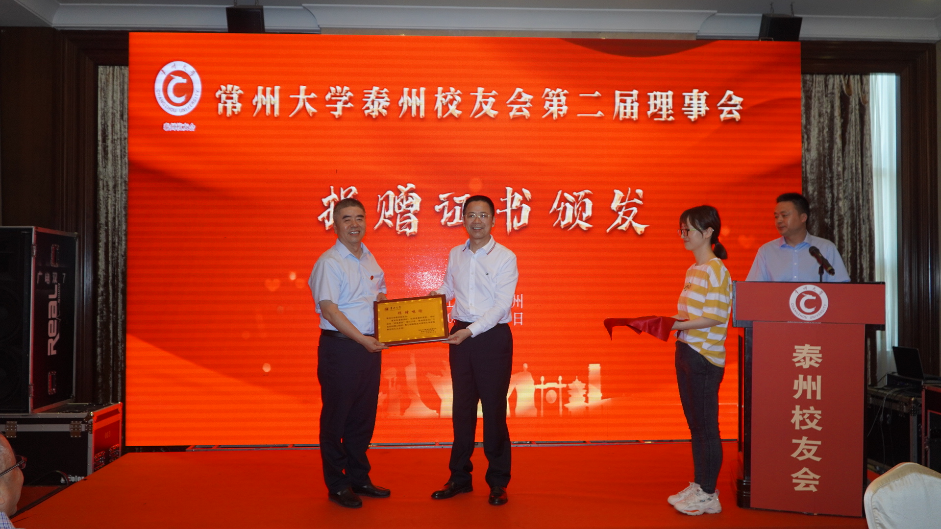 陆锦冲为泰州校友会颁发“一起捐”校友基金捐赠证书