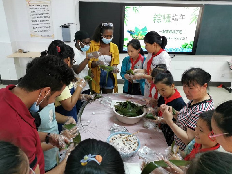 中外师生共同观看了介绍端午节的视频,了解了端午节的由来,学习了“赛龙舟”“包粽子”等端午传统习俗的文化内涵,并进行了端午节文化知识竞赛,场面十分热烈。来自我校后勤服务中心的老师现场讲解并手把手教中外师生卷粽叶、放白米、加馅料、系扎带。来自老挝的留学生VONGXAY VEOMANY(林富洋)同学已经是第二次参加端午节包粽子活动了,她表示:“与去年相比,今年的活动因为小朋友们的加入增加了很多乐趣,在彼此帮助的过程中,我感觉自己与中国朋友更加亲近了。”
