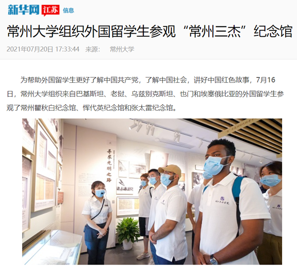 为帮助外国留学生更好了解中国共产党,了解中国社会,讲好中国红色故事,7月16日,常州大学组织来自巴基斯坦、老挝、乌兹别克斯坦、也门和埃塞俄比亚的外国留学生参观了常州瞿秋白纪念馆、恽代英纪念馆和张太雷纪念馆。