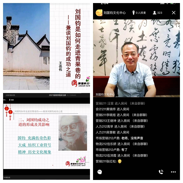 为加强文化传承教育,增强新生对学院的认同感和荣誉感,帮助新生更快更好地适应大学生活,9月14日下午,商学院 刘国钧管理学院邀请刘国钧文化中心主任、常州老年大学副校长王亮伟通过视频连线的方式,以“纺织巨子 知困自强——如何适应大学生活?”为主题面向全体新生举办入学教育讲座。