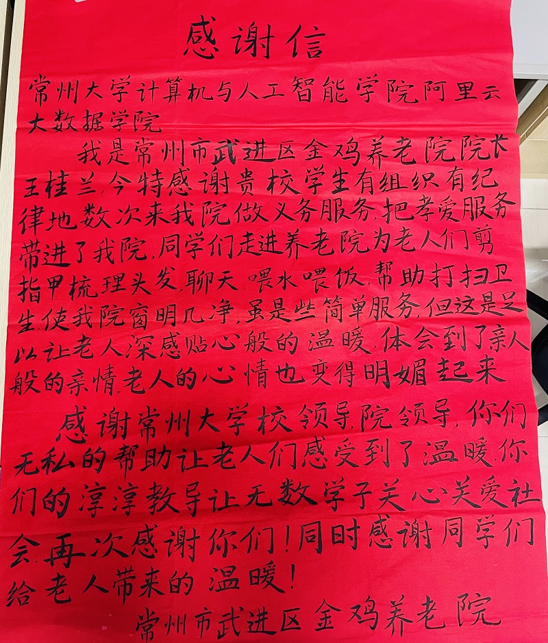 11月24日,常州市金鸡养老院院长王桂兰和活动负责人张林妹一行专程l来校,送来了一封老人们亲手写的感谢信,表达对我校学子积极投身志愿服务的感谢,计算机与人工智能学院 阿里云大数据学院 软件学院党委书记陆恒接待来访一行。