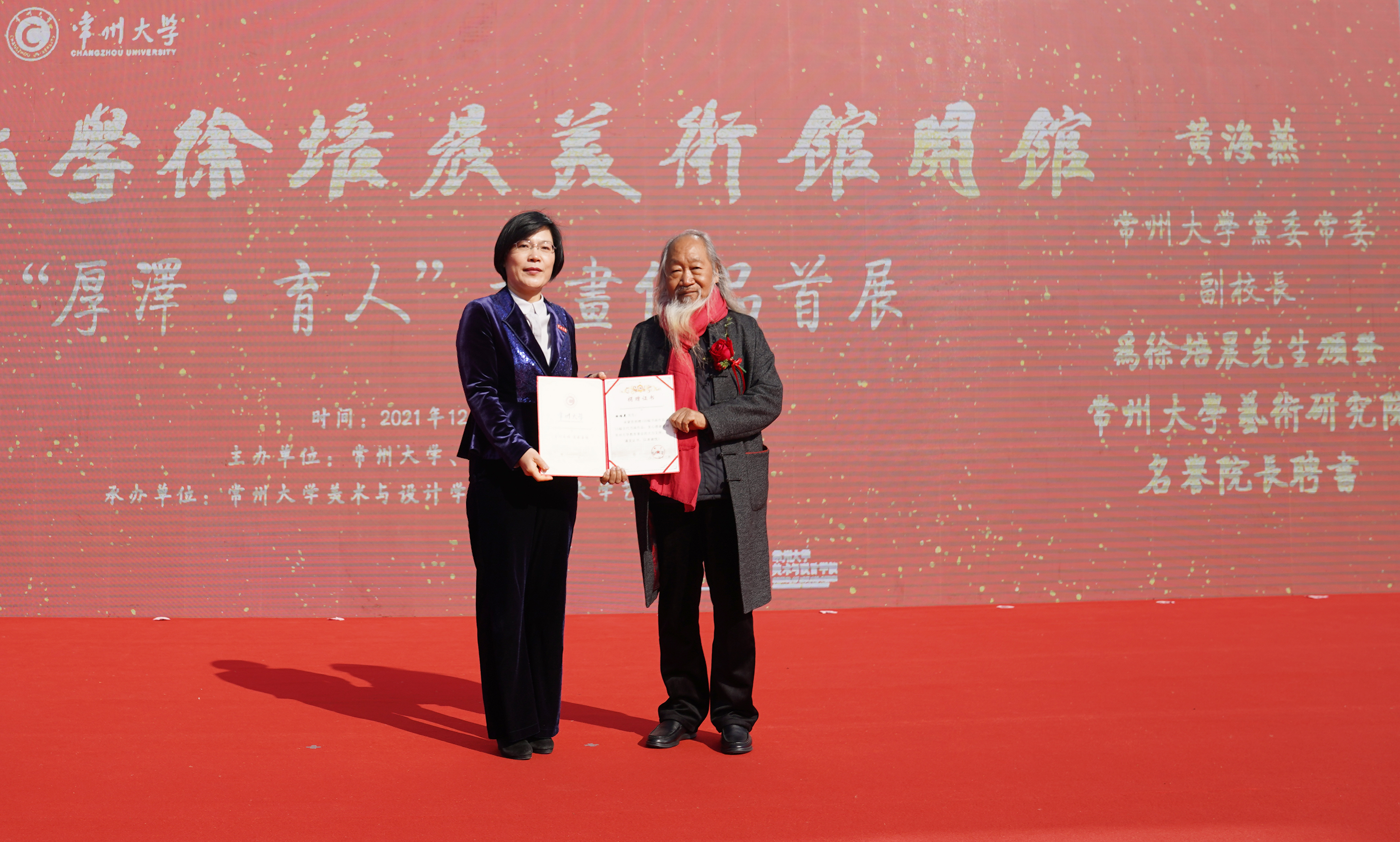 黄海燕为徐培晨颁发捐赠证书和常州大学艺术研究院名誉院长聘书。与会领导共同为常州大学徐培晨美术馆揭牌。