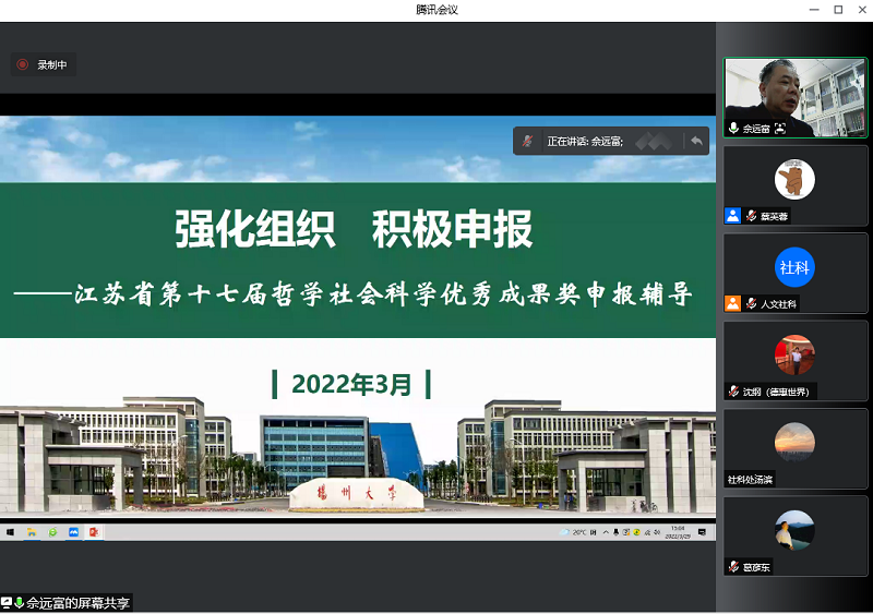3月29日下午,人文社科处通过线上方式举办哲学社会科学优秀成果奖辅导会,扬州大学马克思主义理论博士后科研流动站站长、原扬州大学人文社科处处长佘远富为我校教师作专题辅导报告。拟申报教师、人文社科处全体工作人员等100余人参加辅导会。人文社科处处长葛彦东主持会议。
