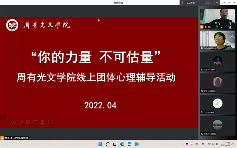 为了让同学们保持宅校不宅心的积极心态,4月13日下午,周有光文学院邀请校心理健康教育与研究中心蔡亚敏与李秋云老师携手进行线上心理团体辅导活动。