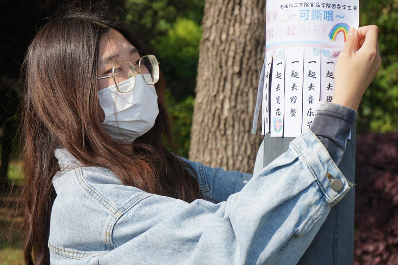近日,石化学院在校园内开展张贴“心愿便利贴”志愿活动。同学们用富有创意的图案文字手制了各具风格的便利贴,每一笔都蕴含着希望。灯柱上、树干上、花坛旁……校园内的各个角落都贴满了“浓浓真情”。“一起吃火锅”“一起看电影”“一起去露营”“一起去海边”“一起去音乐节”……这些心愿便利贴承载了“成功抗击疫情”的愿望。