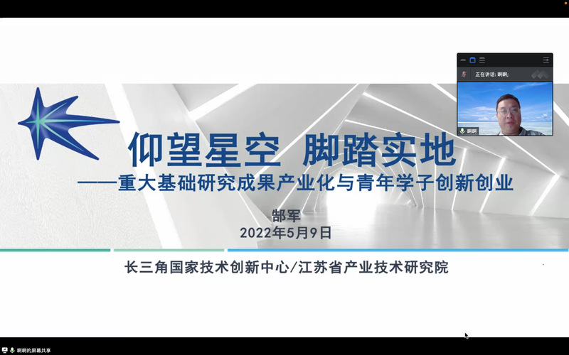 5月9日,江苏省产业技术研究院副院长、长三角国家技术创新中心主任助理郜军应邀为我校作“重大基础研究成果产业化与青年学子创新创业”线上讲座,讲座通过腾讯会议和微信视频号等同步直播,我校2020级、2021级技术转移研究生、技术转移校内外导师及众多业内人士参加讲座。