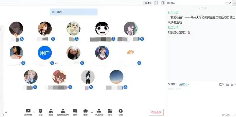 在线上心理援助主题沙龙活动中,社工专业的同学主讲,以匿名保密的形式保护参与者隐私,鼓励同学们分享介绍自己阅读的书目及观看过的影视作品并发表自己的观点,每位组员都积极参与自由发言阶段,分享疫情下的心得与感受,讲述感人的抗疫故事,激励学子尽其所能,与国同心,与校同行,共克时艰。针对不同情况,同学们及时进行探讨与自我疏导。社工还引入正念冥想,帮助同学们与自己的情绪对话,增强自信、释放压力,与负面情绪和解。