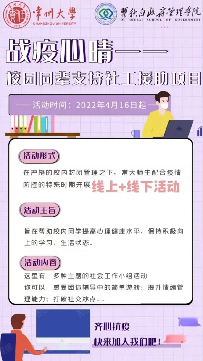 为帮助同学们保持良好稳定的学习和生活状态,近日,由常州大学校团委主办、瞿秋白政府管理学院承办的“战疫心晴”——常州大学校园同辈社工援助项目在全校范围内迅速展开。