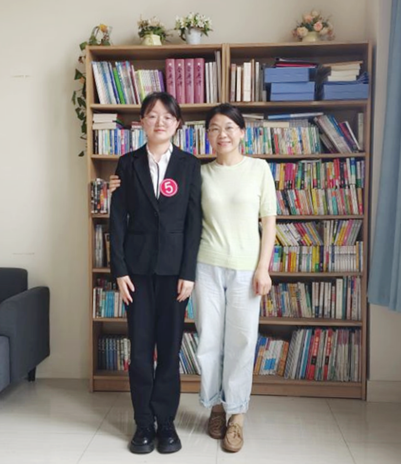 日语192班李利丽同学(左)获本科组一等奖与其指导老师吴丽霞(右)合影