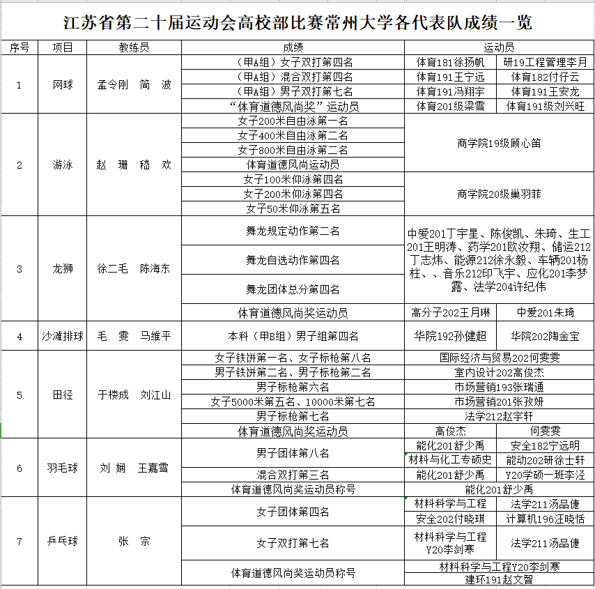 历时两个多月的江苏省第二十届运动会高校部比赛圆满落幕。我校共参加9个项目的比赛,各参赛队不怕困难、顽强拼搏,获得2金4银5铜的好成绩,团体总分达138分,创造了常州大学参加省运会历史得分新高。