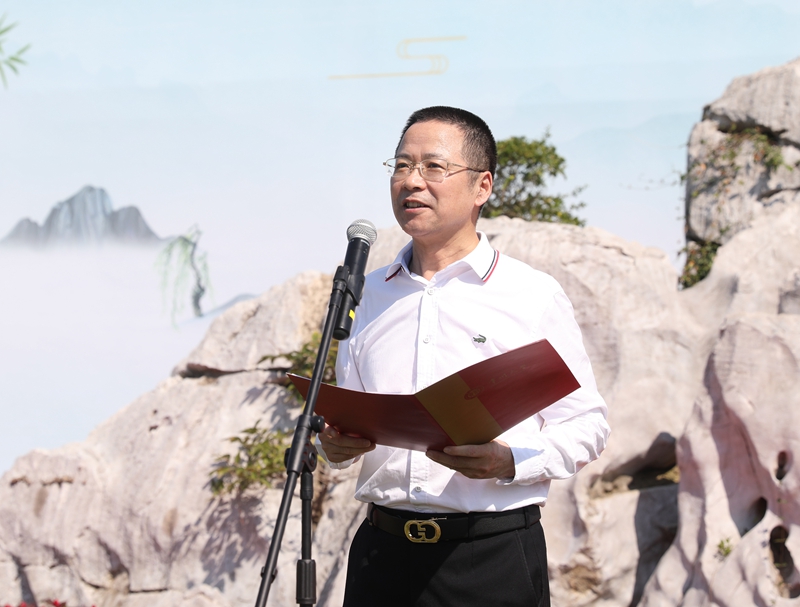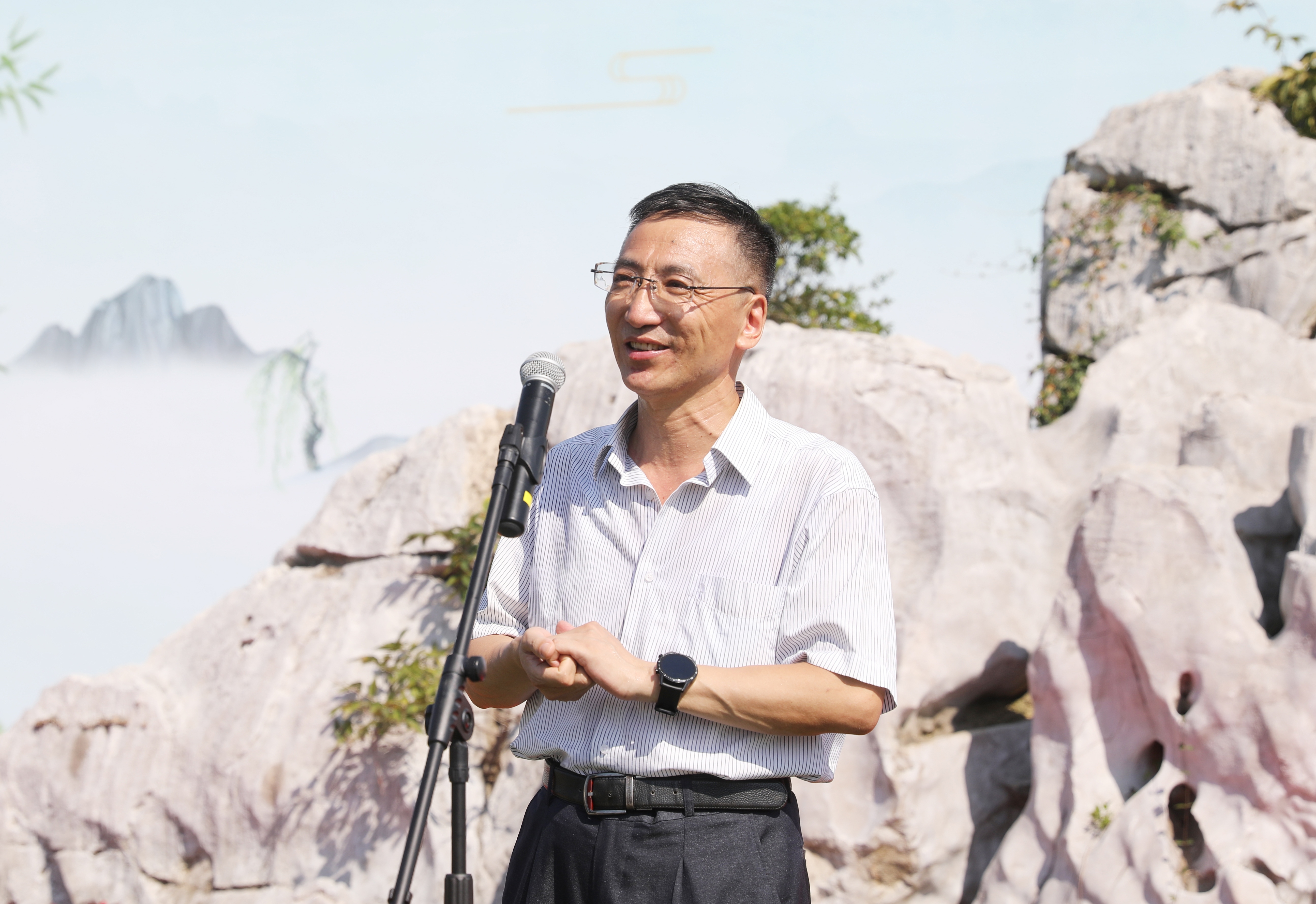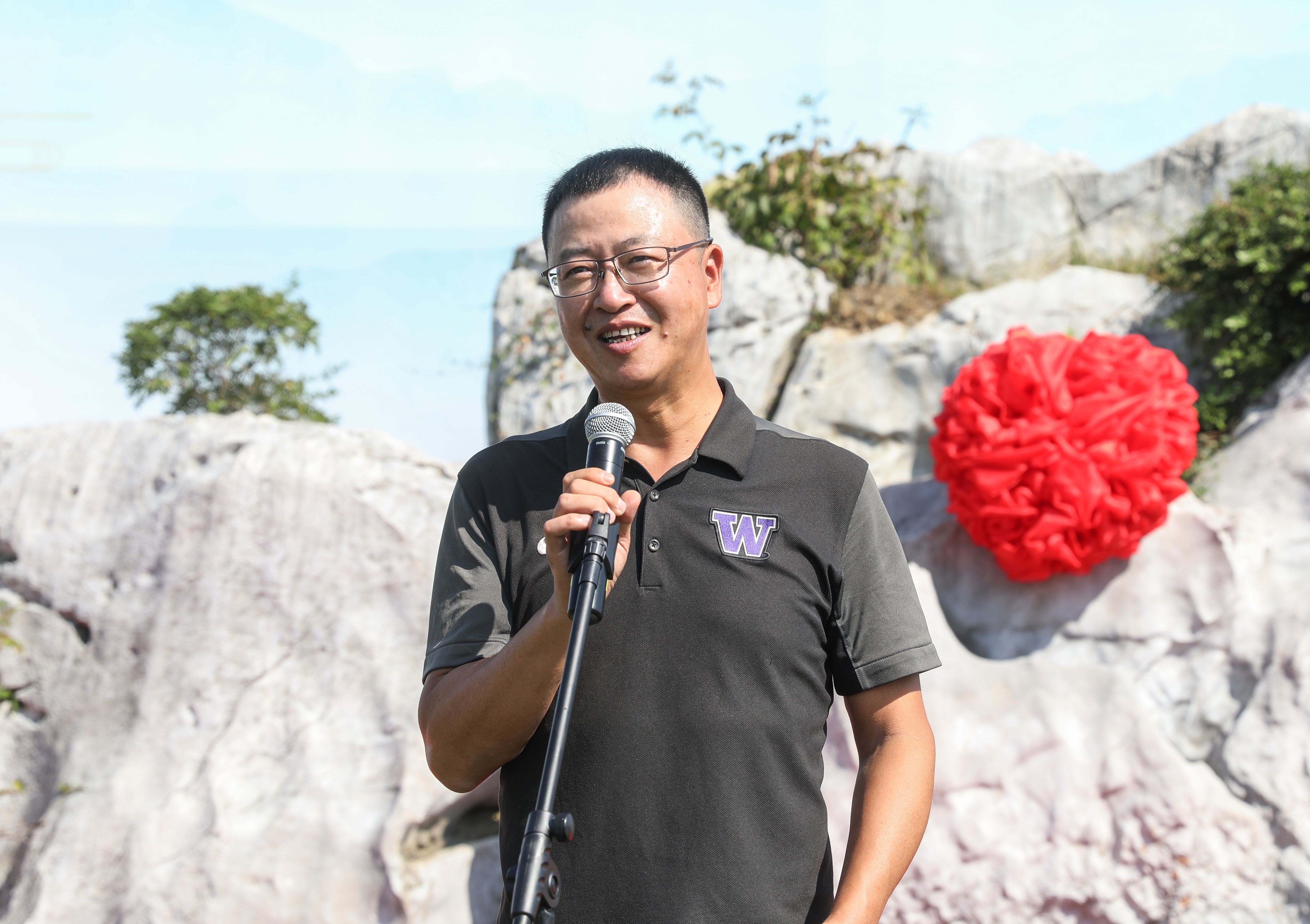 高分子88级校友代表贺明发言,他感谢母校的培养,表达了全体高分子88级校友对母校的情感如这方景观石般厚重绵长。