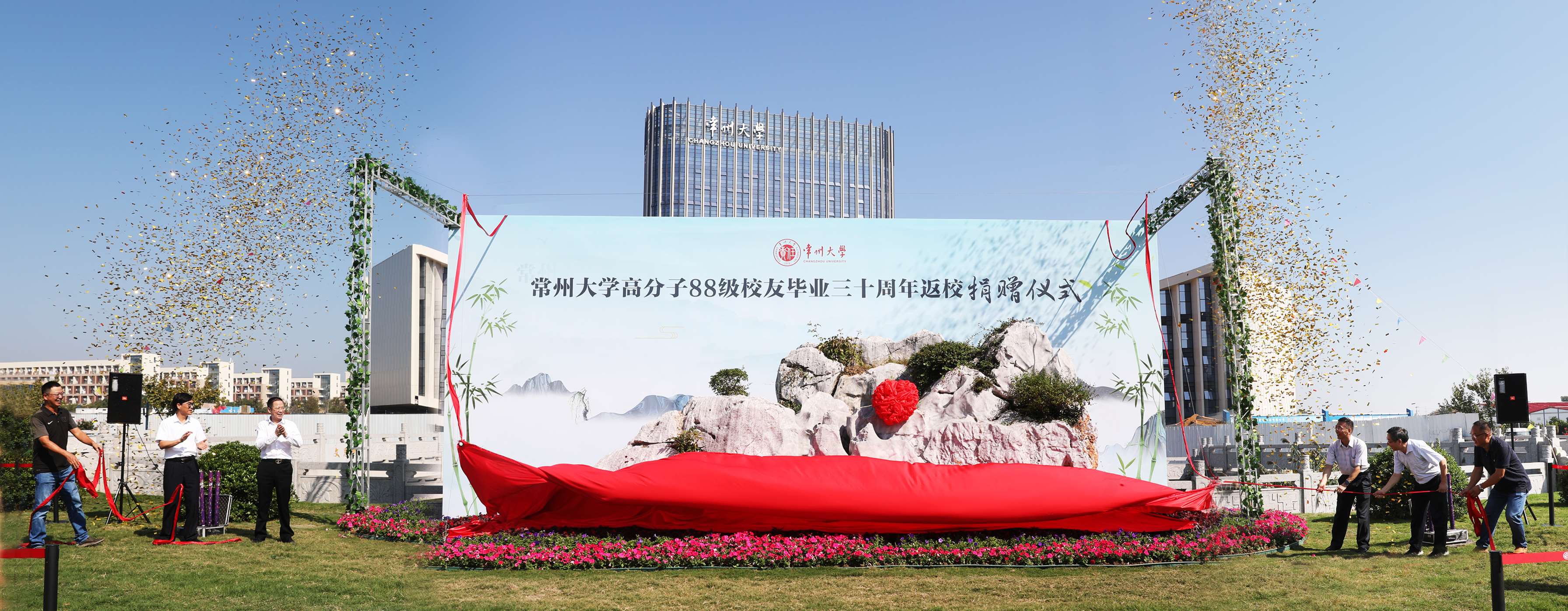 陆锦冲,龚方红,高分子88级校友代表徐国光、贺明,我校教育发展基金会相关负责人,材料科学与工程学院相关负责人为景观石揭幕。