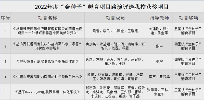 本次评选活动中,学校认真组织、精心选拔,参赛队伍积极参与、出色发挥,陶晋、李飞、卞国全、王馨钰团队(指导老师:刘建刚、彭小建、佟金萍)的《常州溧天国际供应链管理有限公司跨境电商项目——外循环助推器小而美新外贸》获评五星级“金种子”孵育项目;房加美、计益翔、胡一旸、俞滨烨、张智凡,刘磊,杨露团队(指导老师:张琳)的《超临界低温蒸发低碳节能消雾节水“零雾”环保型冷却塔》和奚颖、刘毅、许芳、黄好港、赵宥畅、董珂昕、王琪团队(指导老师:张琳)的《炉火纯青:高效低氮安全型热载体炉》2个项目获评四星级“金种子”孵育项目;殷鹏、林文博、陈胜楠、尹婕、冯苛玉、张承诺、黄少娟,黄建霖团队(指导老师:李宁、曾芳磊)的《生物质聚氨酯助力医用耗材“脱碳”技术》和殷志强、朱志豪、邓建军、贾音、程效龙、李强龙、马甜甜、王少聪、曹诚、李俊佚、江松波、戴凌、谢子菡团队(指导老师:张华君、石林、袁宝华)的《基于HarmonyOS的校园防疫一体化系统》2个项目获评三星级“金种子”孵育项目。路演评选既体现了常大学子过硬的专业水准,又彰显了常大学子心系社会、服务社会的使命和担当。