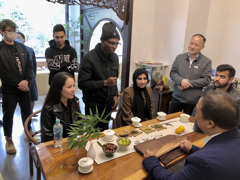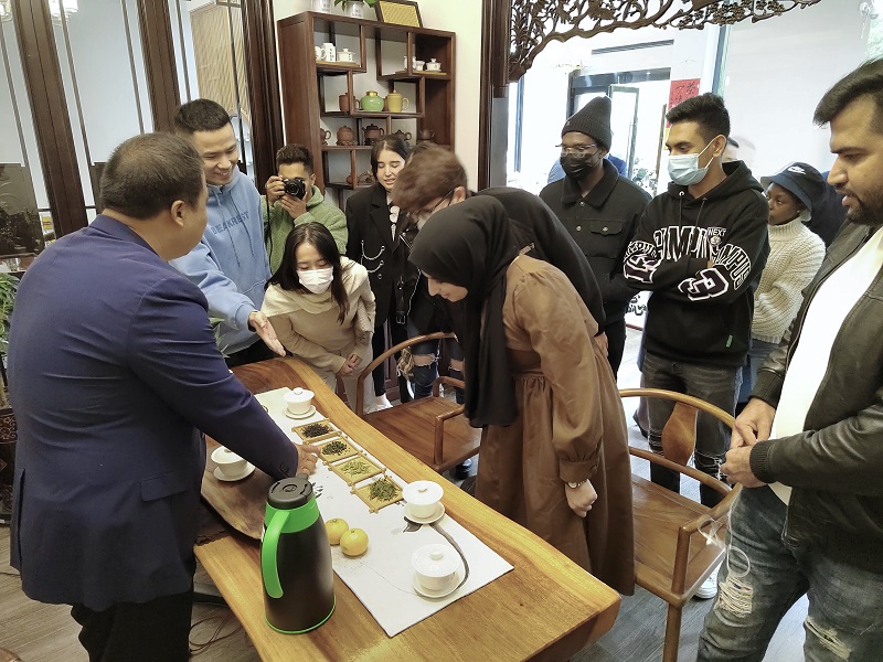 在常州市得春谷蕊茶叶有限公司负责人带领下,留学生参观了茶叶展览陈列馆,了解了中国茶文化的历史和不同的茶叶种类,品尝了香气扑鼻的绿茶,他们分别用中文、英语及其母语表达了品后感。来自巴基斯坦的留学生纳比亚表示:“我会好好学习中国茶文化,将健康、养生的溧阳茶叶推广传递到世界各个角落,让更多人喝上清香浓郁的溧阳茶叶。”