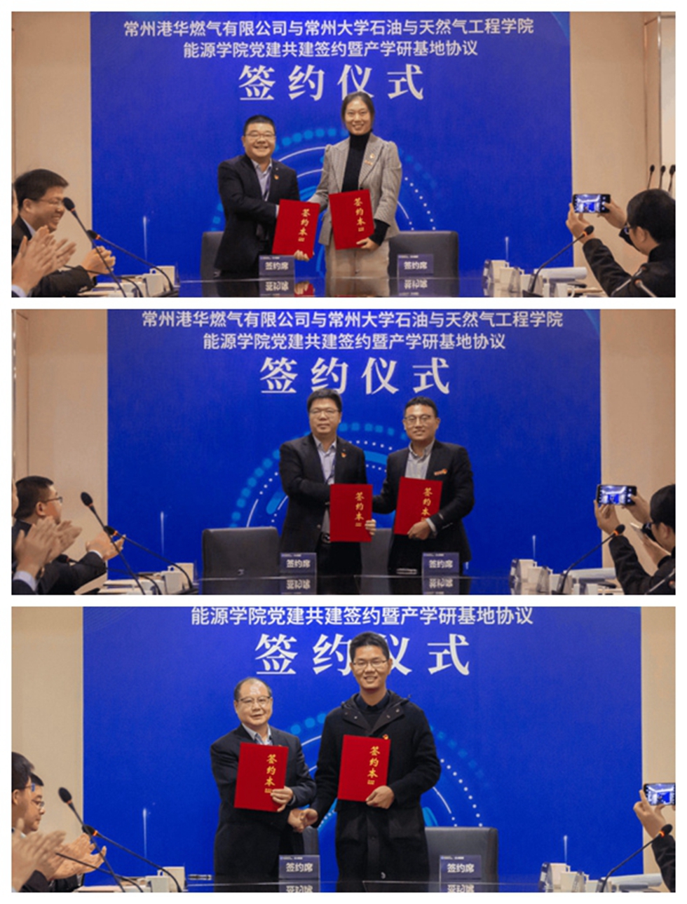 双方代表共同签署了常州港华燃气有限公司党总支一支部——石油与天然气工程学院党委行政服务党支部共建协议,常州港华燃气有限公司党总支二支部——石油与天然气工程学院党委储运教师党支部共建协议,常州港华燃气有限公司党总支三支部——石油与天然气工程研究生党支部共建协议。