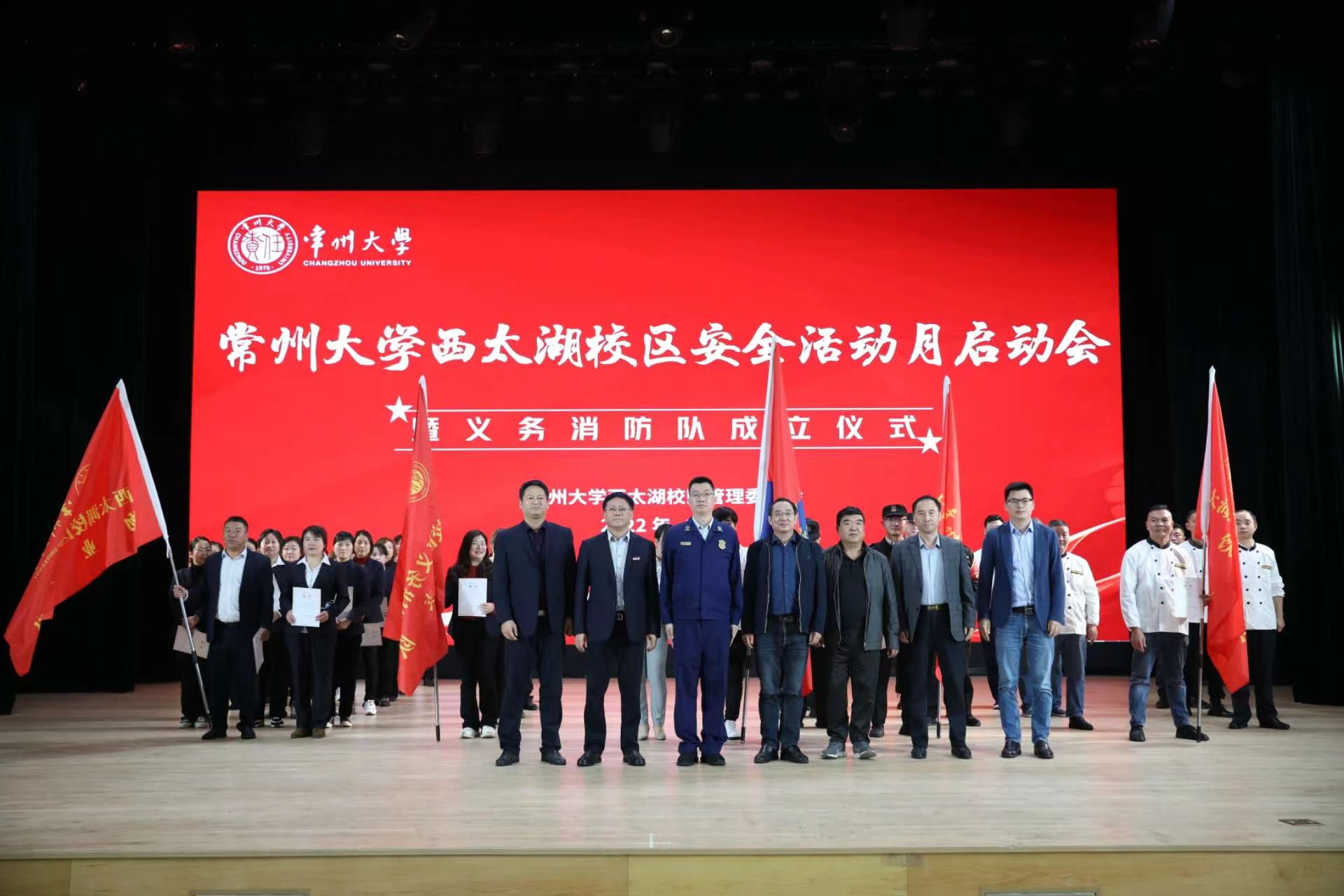 11月10日下午,西太湖校区管理委员会在西太湖校区立艺楼千人会堂举行安全宣传月启动仪式暨义务消防队成立仪式。常州市消防救援支队新闻宣传科科长周祥,西太湖校区管理委员会主任孙峰,后勤服务中心主任葛和生,学院师生代表,西太湖校区后勤服务中心、保安队伍及服务保障单位职工参加会议。
