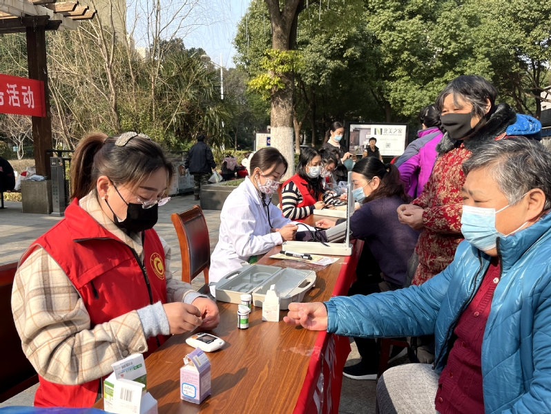 学院发挥护理学专业优势,为社区中老年居民义务开展血压、血糖检测,针对中老年健康养护等方面提供免费的专业咨询。活动期间,院团委志愿者通过发放健康宣传手册、主动讲解等方式为社区中老年居民开展健康教育,深受社区居民赞许。