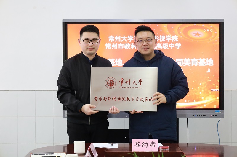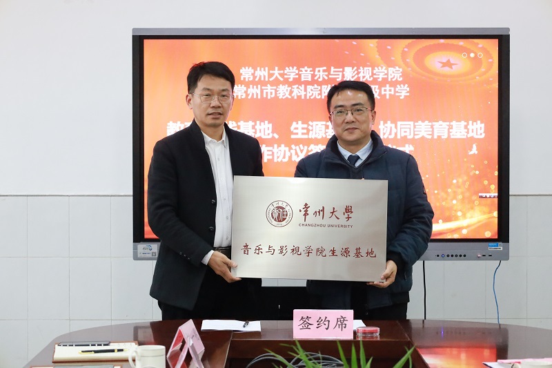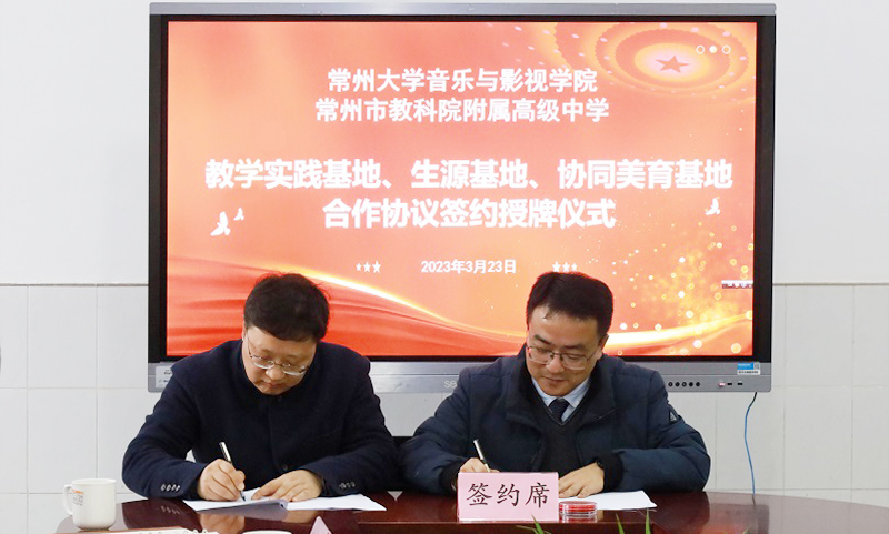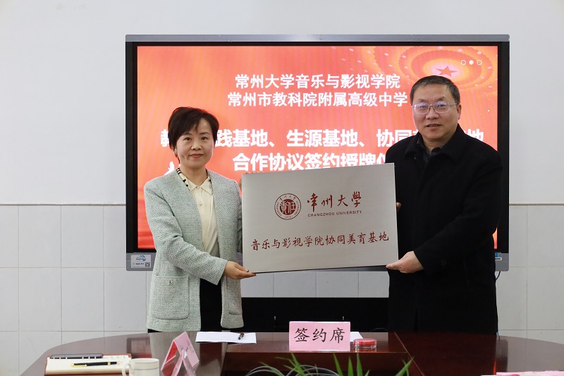 3月23日下午,音乐与影视学院与常州市教科院附属高级中学进行共建教育实践基地、生源基地、协同美育基地签约授牌仪式,常州大学教务处处长薛冰,音乐与影视学院党总支书记唐琳、院长熊祖鹏、学院相关负责人,以及常州市教科院附属高级中学党支部书记黄文青、校长陈小刚、副校长卜方和各处室负责人出席签约授牌仪式。